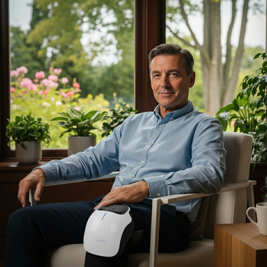 Retrouvez la liberté de bouger sans douleur. Une chaleur douce et un massage personnalisé pour soigner vos genoux, jour après jour.